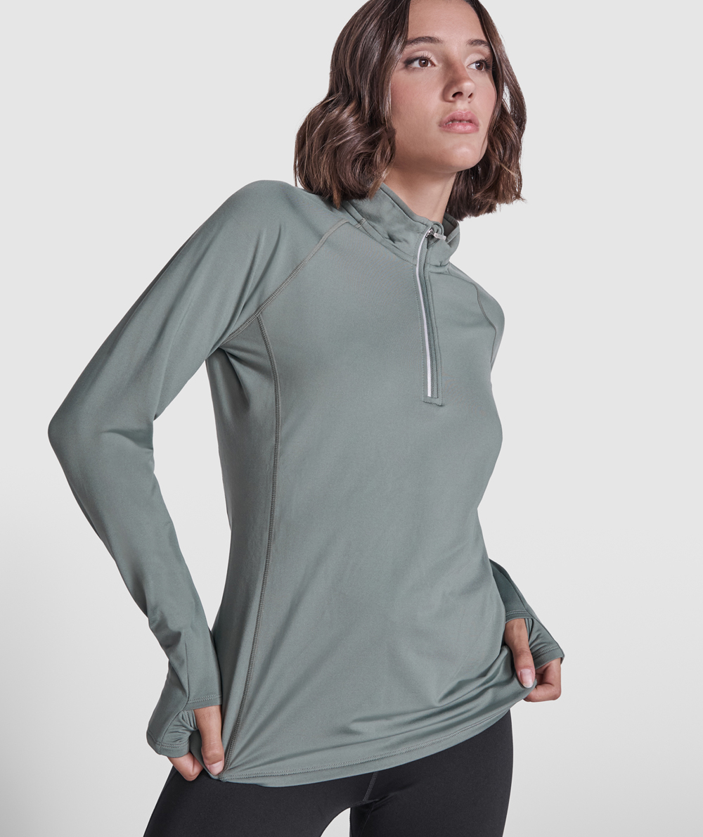 • felpa tecnica garzata aderente con maniche raglan e zip invertita a mezza lunghezza con dettaglio riflettente.
